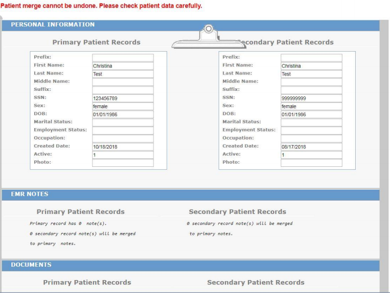 - The system will now generate any potential matches the system finds for duplication. You will notice that it has populated a “Primary Patient Record” as well as a “Secondary Patient Record.” Each duplicate account will show twice, once under each column.