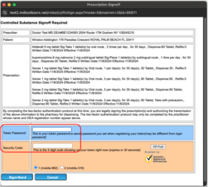 8. The prescribing provider must be able to electronically Sign & Send the controlled prescription after entering the correct token password and security code.