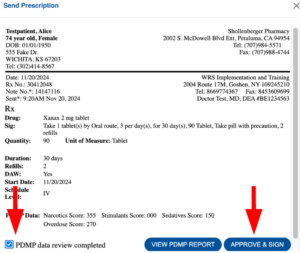 5. To finalize for sending, tick the PDMP Data review completed checkbox, then click the APPROVE & SIGN button, this action will trigger the MD Toolbox Signoff window. A confirmation message will be displayed after the prescription in View Note.