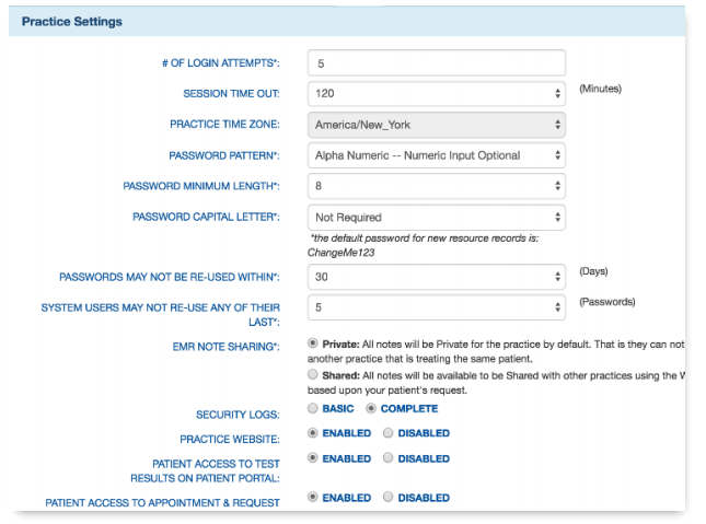 Administration → System Settings → Practice Settings