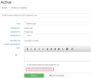 Once the refill has been Accepted or Denied and Sent, the provider can view all completed requests in their task queue and open any request to view the prescription in its entirety.
