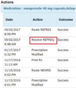 Electronic requests that have been approved/denied via the task queue, by the provider will add in the next newly opened note, to the Medications page > Previously Prescribed Medications and to the ORIGINAL prescribed medication. The action will be queued and can be accessed by the VIEW ALL ACTIONS module: