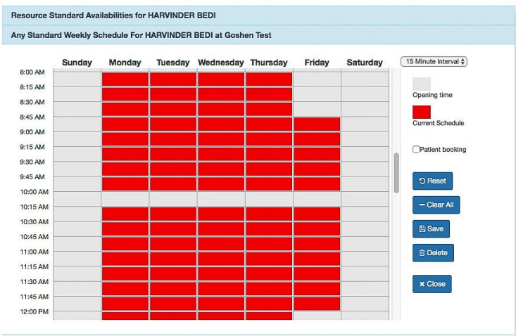 - From here, you will individually select (or click and drag) the time parameters that the provider is available to see patients on any specific days/times. Any box in red signifies that the provider is AVAILABLE to see patients, while any box shaded grey means they are UNAVAILABLE.