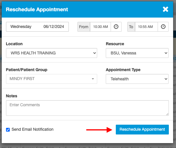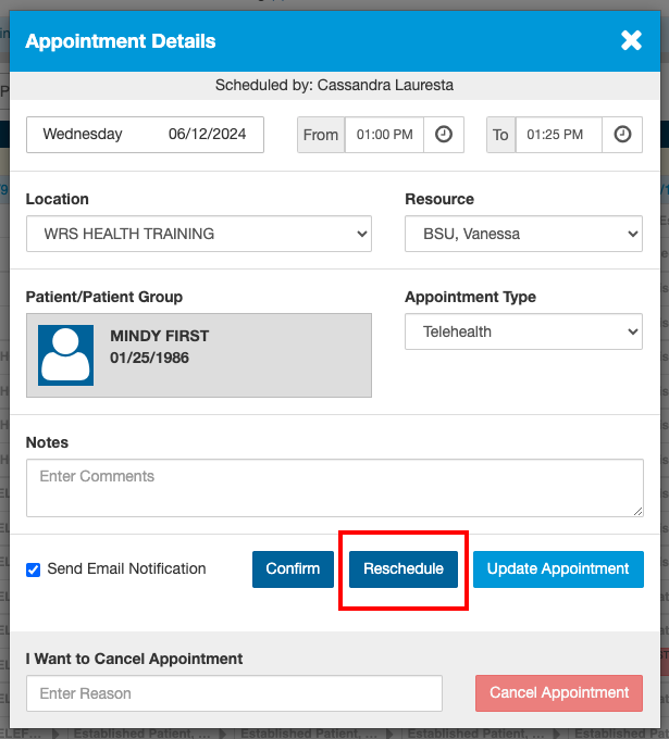 - Select the Appointment that needs to be rescheduled.