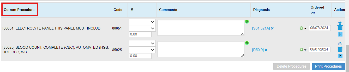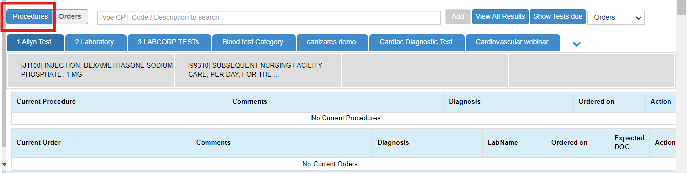- For practices performing laboratory orders at their practice location, CPT codes should be added under the Procedure tab. The added lab orders will then appear in the Current Procedures section.