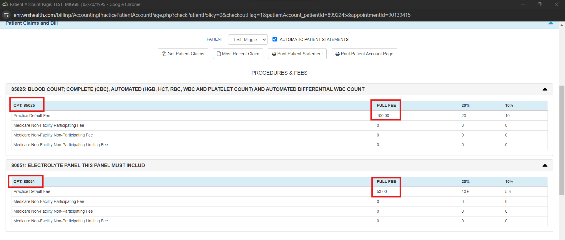 - During check-out, the front desk will be able to view the added CPT codes under the Patient Claims and Bill section. The prices designated for each CPT code in the Fee Schedule Management will be displayed in the Full Fee column. Additionally, discounts of 20% and 10% will be shown.