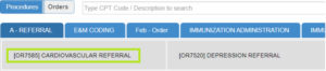 2. Enter the Item Name of the referral you had created under order set – In this example ‘Cardiovascular’. It will then be made available in the drop down list.