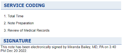 After the note is signed, time and/or activities may be part of the final note depending on your settings in the Time-Based Coding Setup page.
