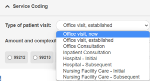 Changing the Type of patient visit will prompt the system to display new coding advice (or warning) and a code will be auto-selected based on the time that was added to the note.