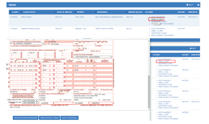 2. Select REBILL CLAIM to resubmit a corrected claim