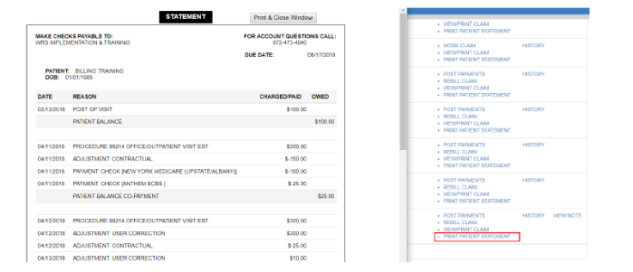 4. Select PRINT PATIENT STATEMENT to view the Statement