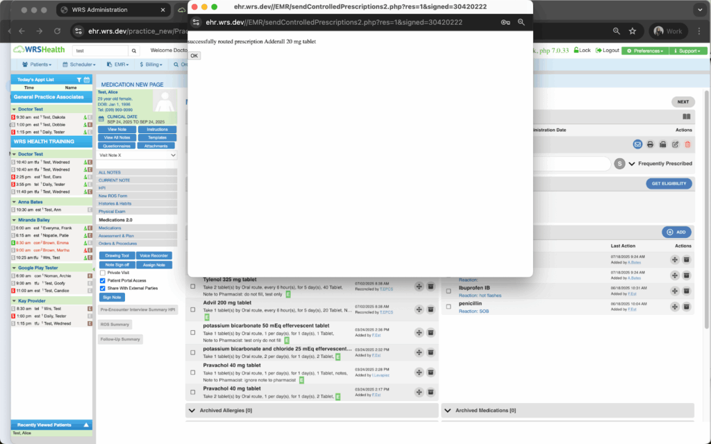 In the EHR, the Prescription Signoff page will show the confirmation message that the controlled prescription has been routed to the pharmacy successfully.